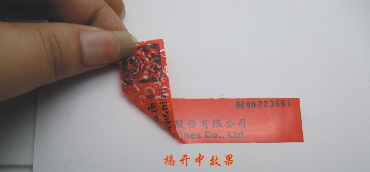 揭開留底防偽標簽是以材料為主的防偽方式,如標簽被揭開就會從面材上分離出預先設定的文字或圖案,如:“VOID”、“啟封”、“已開封”等字樣,并留在被貼物上,從而達到保真的目的,并提供自動檢驗的功能。